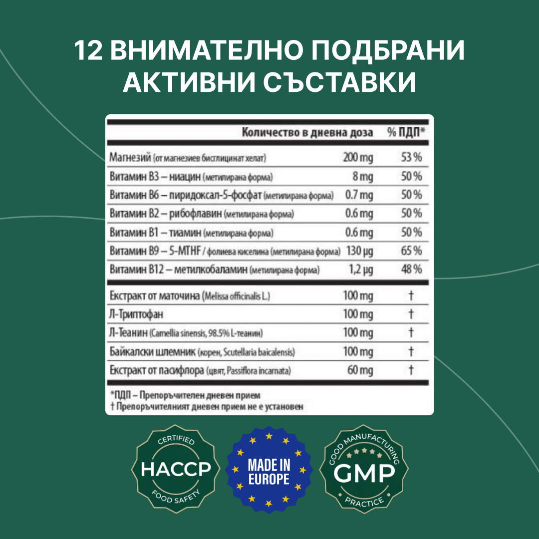 Формулата е насочена към подкрепа на нервната система при състояния на напрежение и тревожност. Тя не е лекарствен продукт и не замества терапия или медикаментозно лечение.